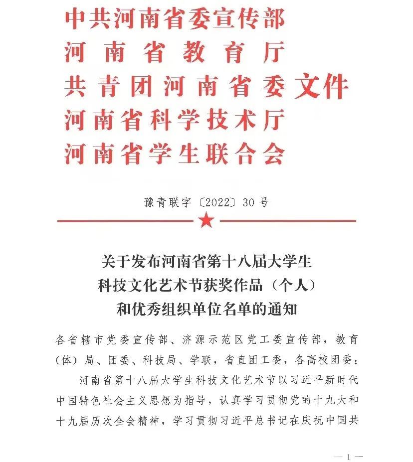 近日,中共河南省委宣传部、河南省教育厅、共青团河南省委、河南省科学技术厅等部门联合下发文件,《关于发布河南省第十八届大学生科技文化艺术节获奖作品(个人)和优秀组织单位名单的通知》。pp电子参赛作品共计获奖27项。其中,一等奖3项、二等奖6项、三等奖10项、优秀奖8项。