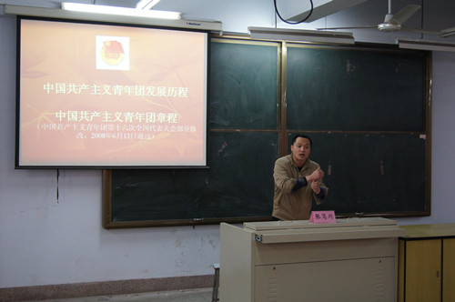 紧随仪式之后,旅游管理系团总支书记张笃川给在座的50名学员上了青年团校的第一课——团的发展历程和中国共产主义青年团章程。同学们认真聆听,并做着笔记。
