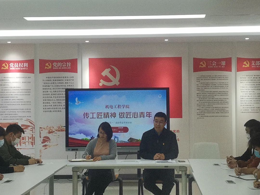 在“五一”国际劳动节来临之际,5月1日上午,机电工程学院在1A212举行“传工匠精神,做匠心青年”庆祝“五一”国际劳动节座谈会。院长张之红,党总支书记张培彦和优秀学生代表参加会议。