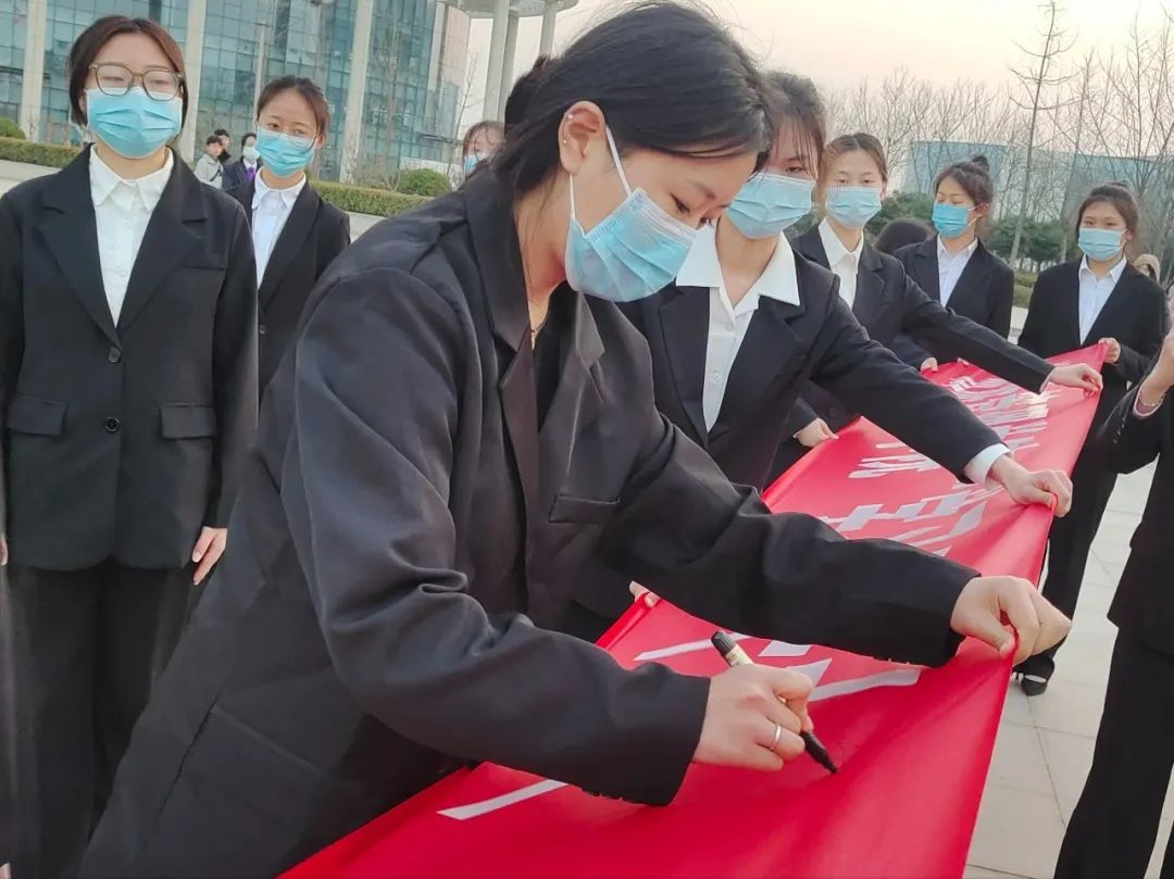 张楗让宣布2023年旅游管理学院“讲好雷锋故事•志愿服务耀青春”雷锋月活动仪式启动之后,领导和老师及寒假社会实践志愿服务优秀学生代表一同来到国旗台前,纷纷在红色的学习雷锋精神长幅上签字留念。