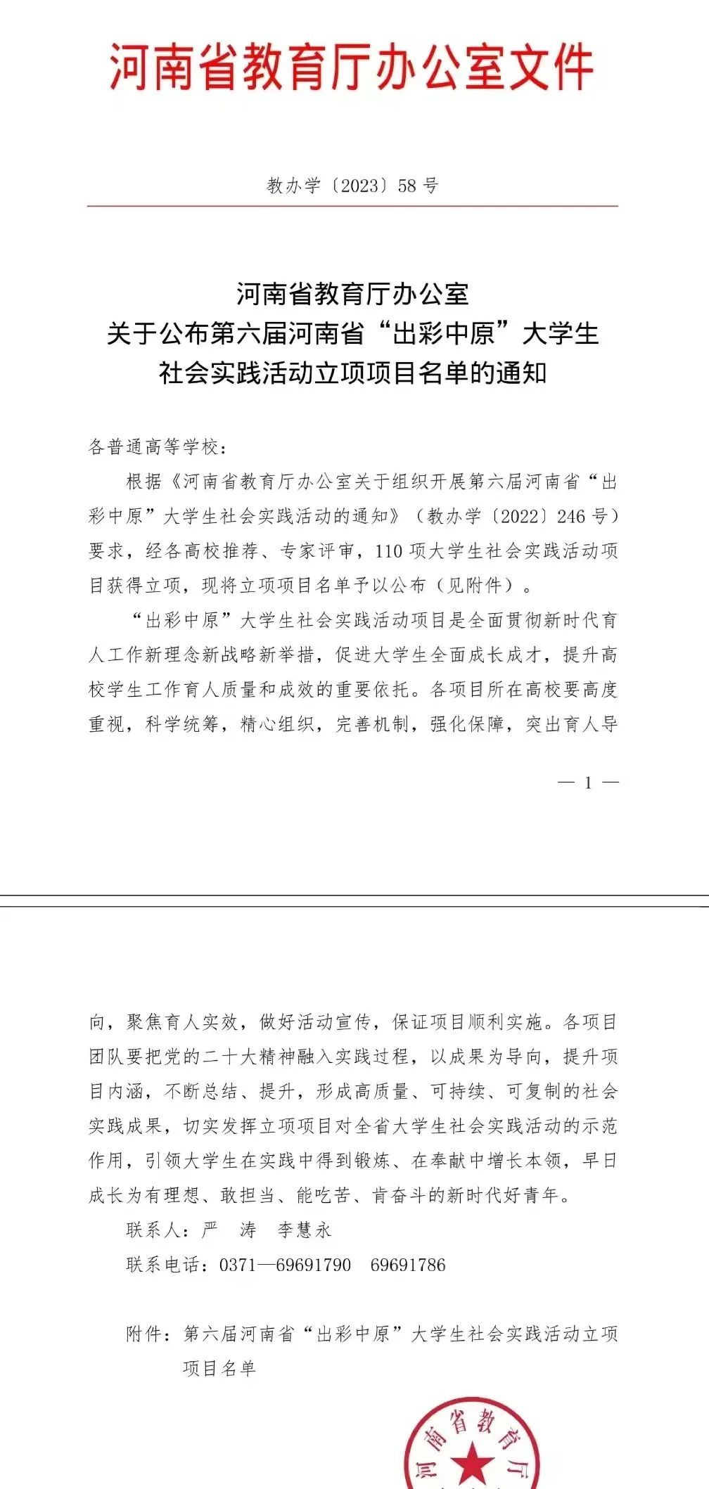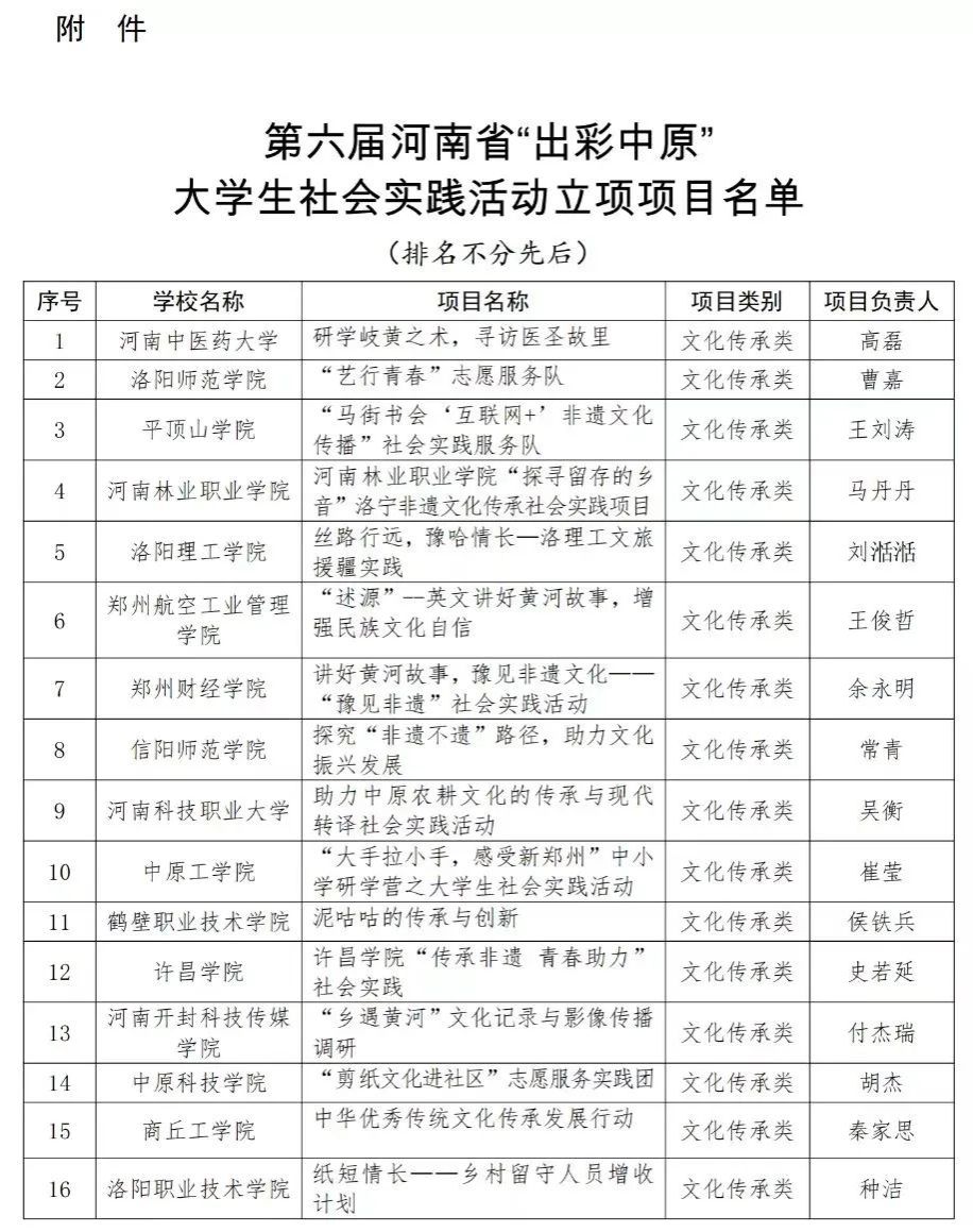 近日,河南省教育厅办公室下发文件,《关于公布第六届河南省“出彩中原”大学生社会实践活动立项项目名单的通知》(教办学〔2023〕58号)。
