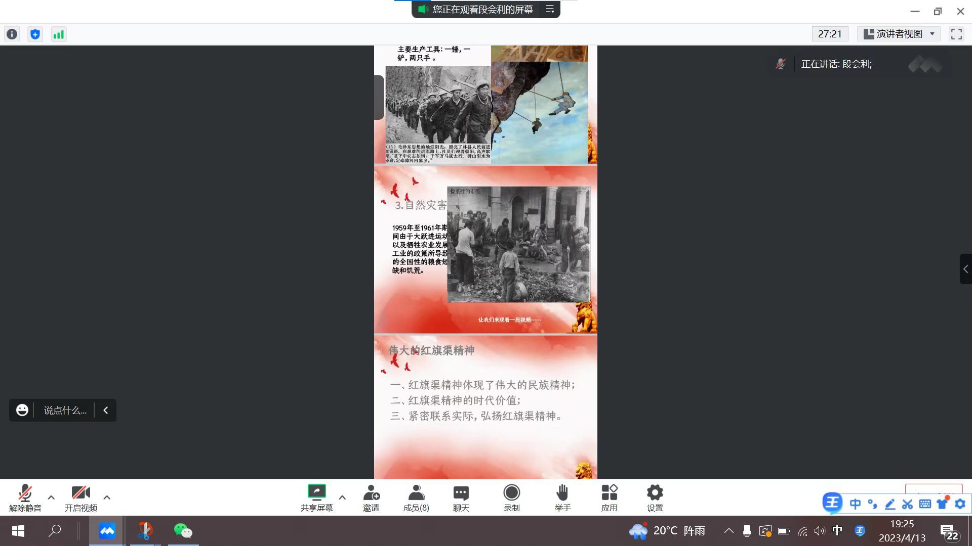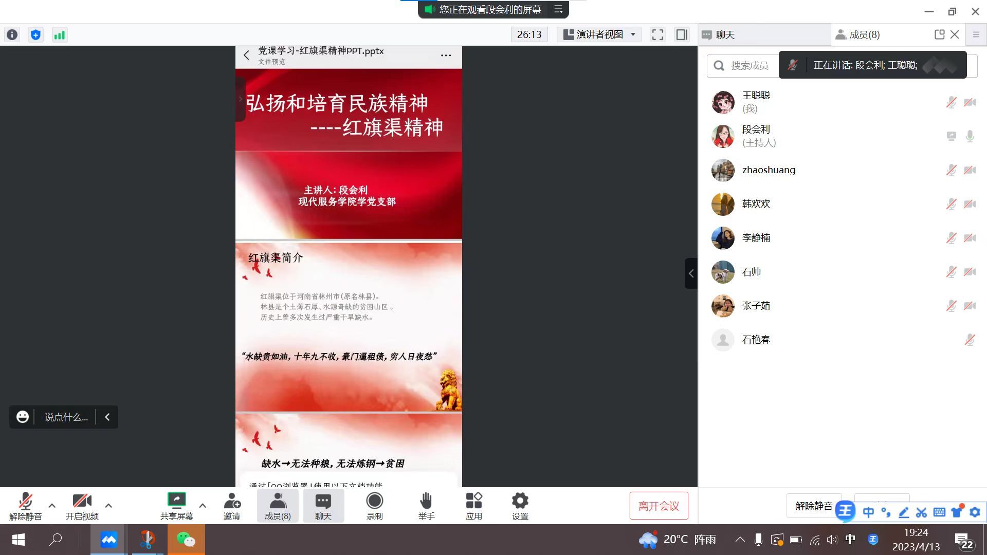 2023年4月13日,我院学生党支部书记段会利围绕红旗渠精神组织各位党员同志在腾讯会议上了一堂精彩党课。