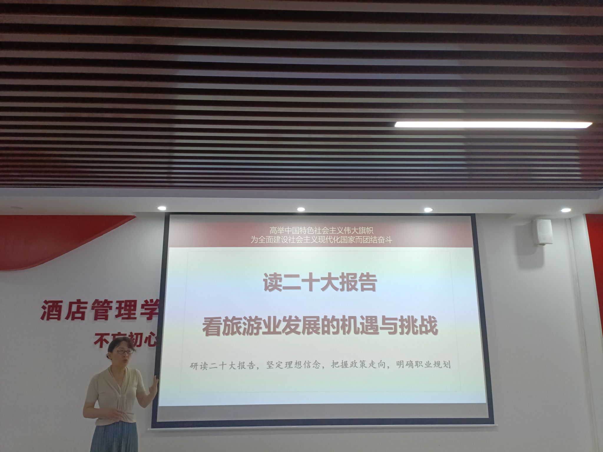 李海燕带领同学们研读了党的二十大报告,为同学们深入浅出地讲解了党的二十大精神。她说,党的二十大报告高瞻远瞩、提纲挈领、内容丰富、思想深邃,既有理论高度又有实践深度。勉励青年学生把个人理想追求融入党和国家事业中,让青春在不懈奋斗中绽放绚丽之花。而后李海燕从党的二十大报告看旅游业发展的机遇与挑战做了解读,叮嘱同学们知行合一,把学习党的二十大精神的成果转化为实际行动,以‘小我’融入‘大我’。