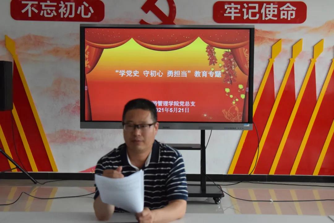 5月21日下午,旅游管理学院“学党史 守初心 勇担当”教育专题活动在党史文化馆开展。党总支书记秦合岗,院长李俊,党总支副书记张楗让,副院长张东月出席活动。全体党员教师参加活动。活动由秦合岗主持。