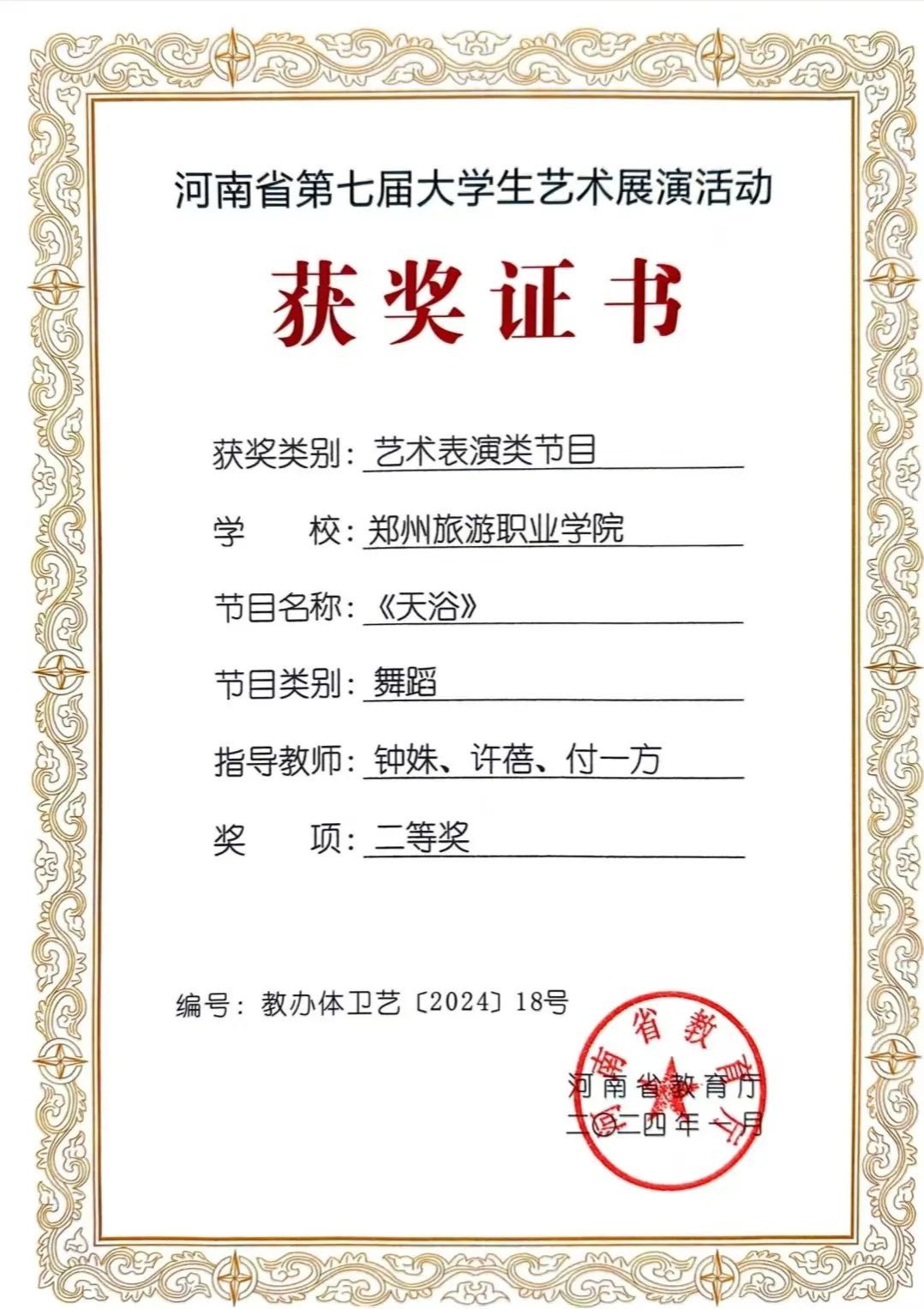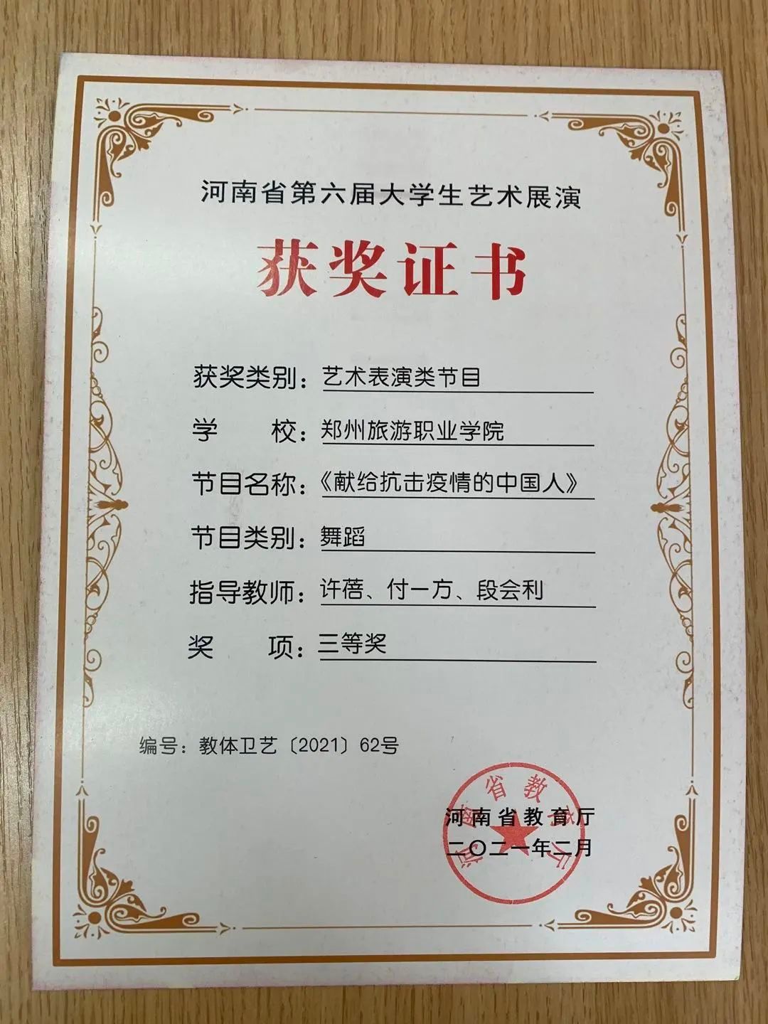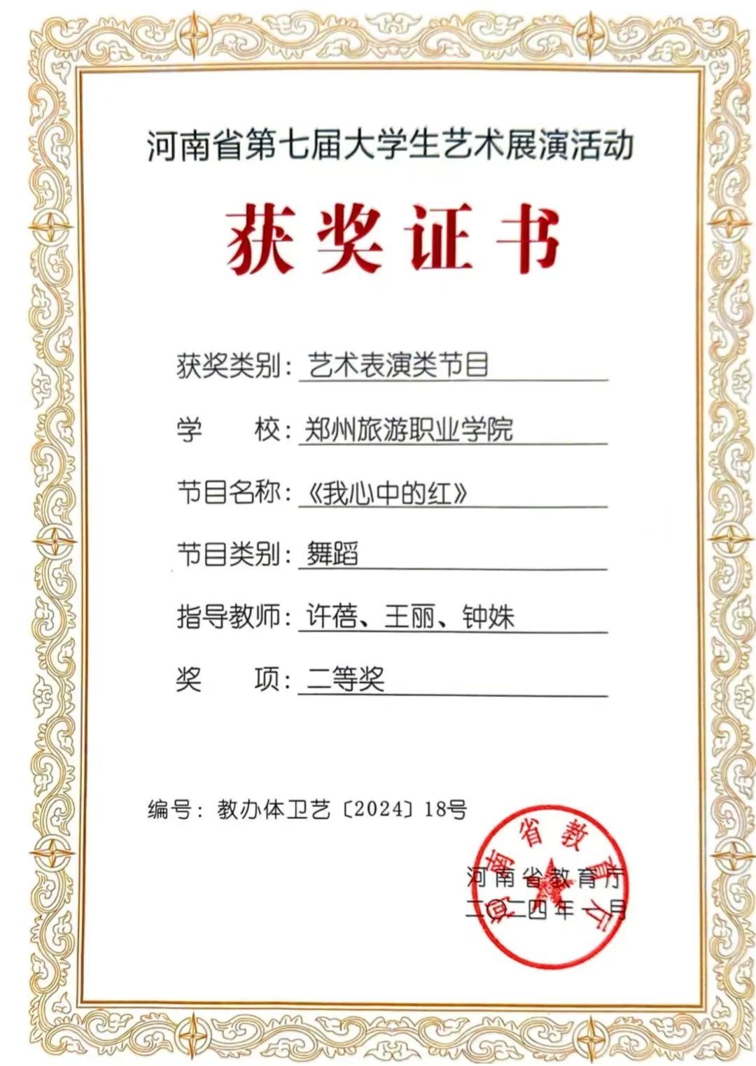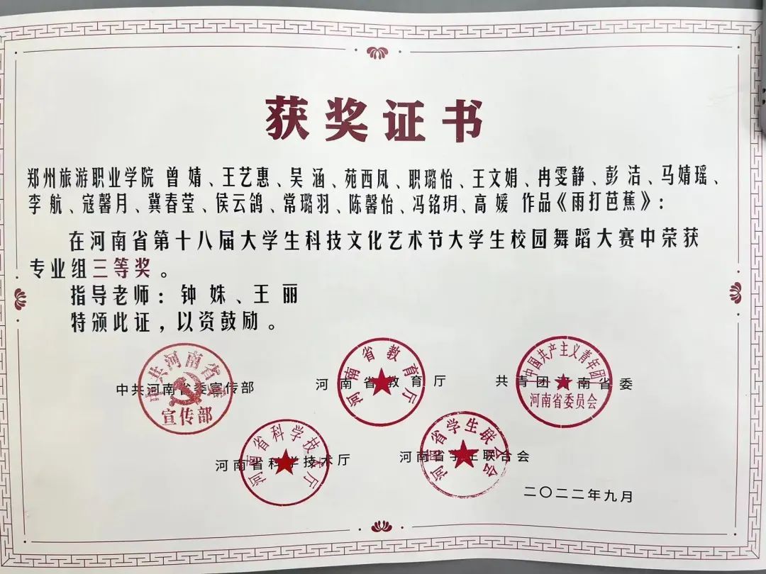 钟姝:中共党员,毕业于河南大学艺术学院舞蹈编导专业,硕士,高校讲师。研究方向:舞蹈学。发表专业论文若干,主持、参与省、市级课题多项。参演作品曾荣获中国舞蹈“荷花奖”银奖,河南省大学生科技文化艺术节专业组一等奖等。指导作品荣获河南省第十八届大学生科技文化艺术节舞蹈大赛专业组三等奖、河南省大学生艺术展演舞蹈类二等奖、郑州市第三届青年舞蹈展演二等奖、第18届中国大学生健康活力大赛第一名等。
