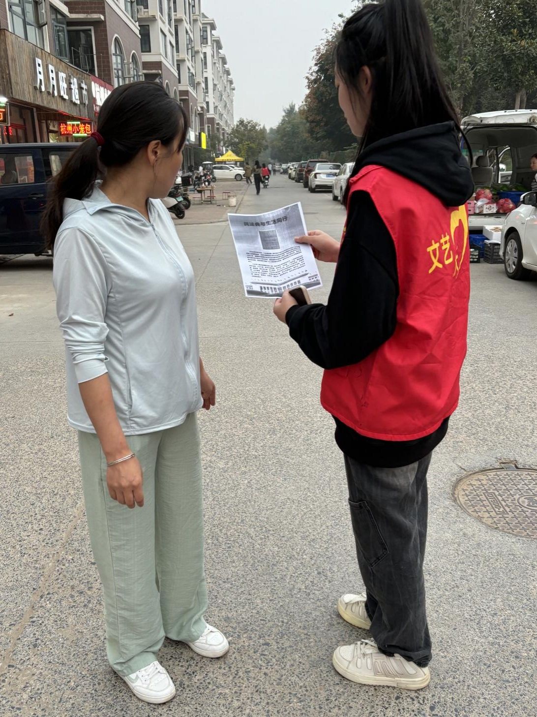 抵达社区后,志愿者们迅速行动起来。他们分成多个小组,有的小组发放普法传单,另一小组负责给居民讲解法律知识。