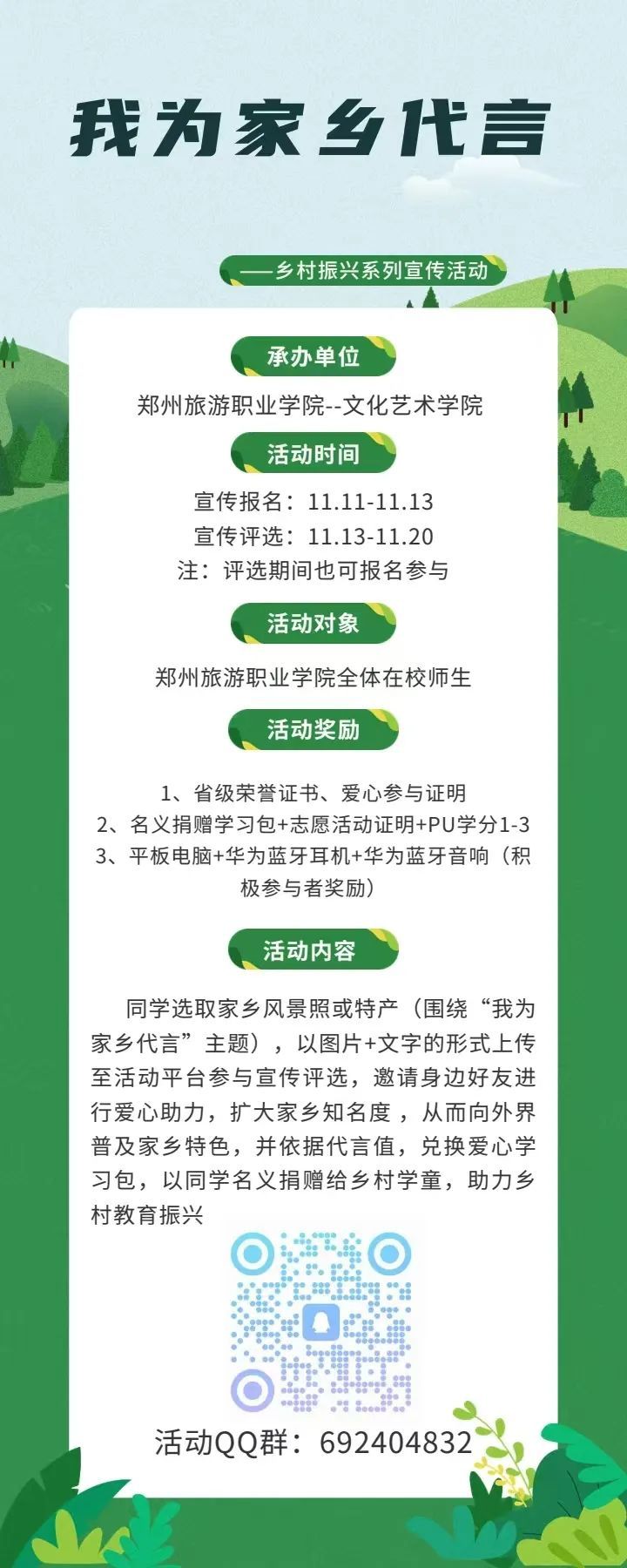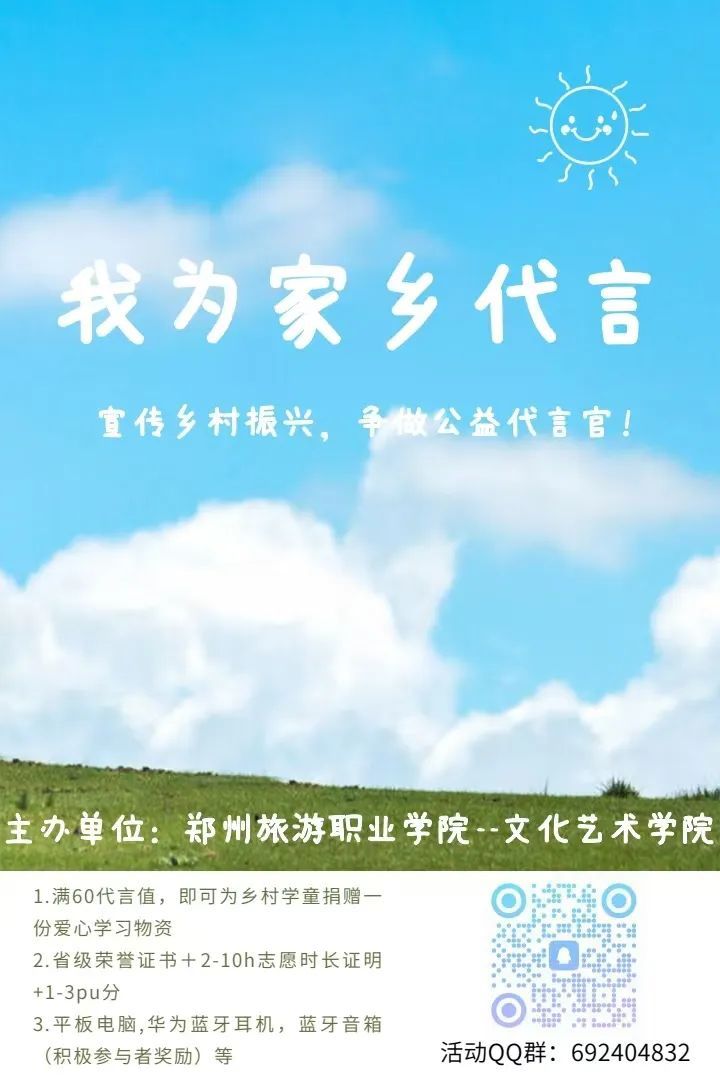 还在等什么呢?同学们,赶紧行动起来,扫描下方二维码加入我们,为家乡代言,让我们的校园因这场充满活力的活动而更加精彩!