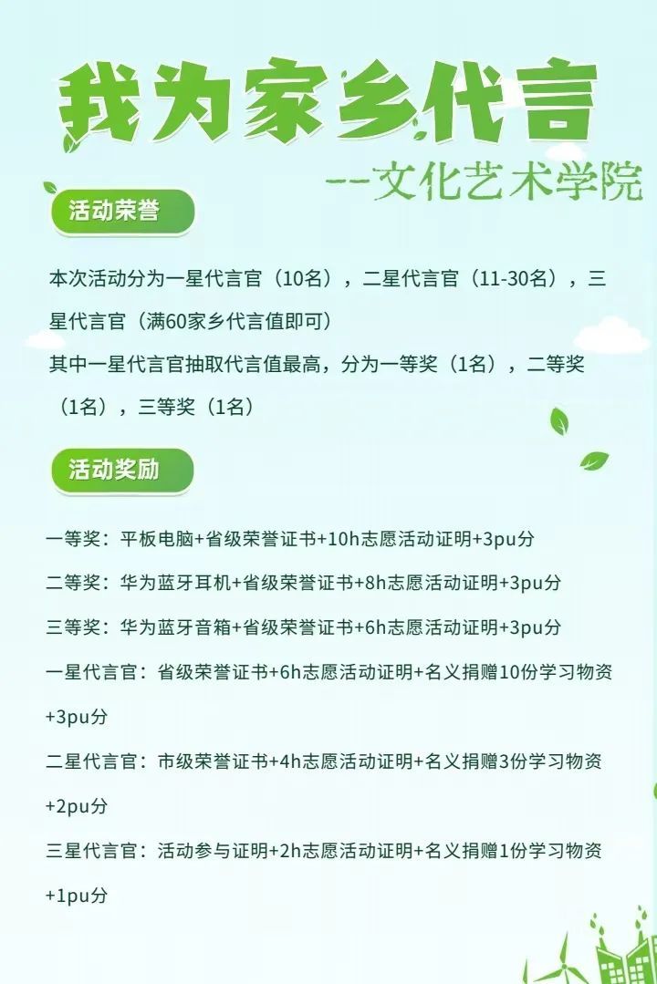 1.作品围绕“我为家乡代言”为主题,以“图片+文字”的形式上传到官方平台参与宣传评选。