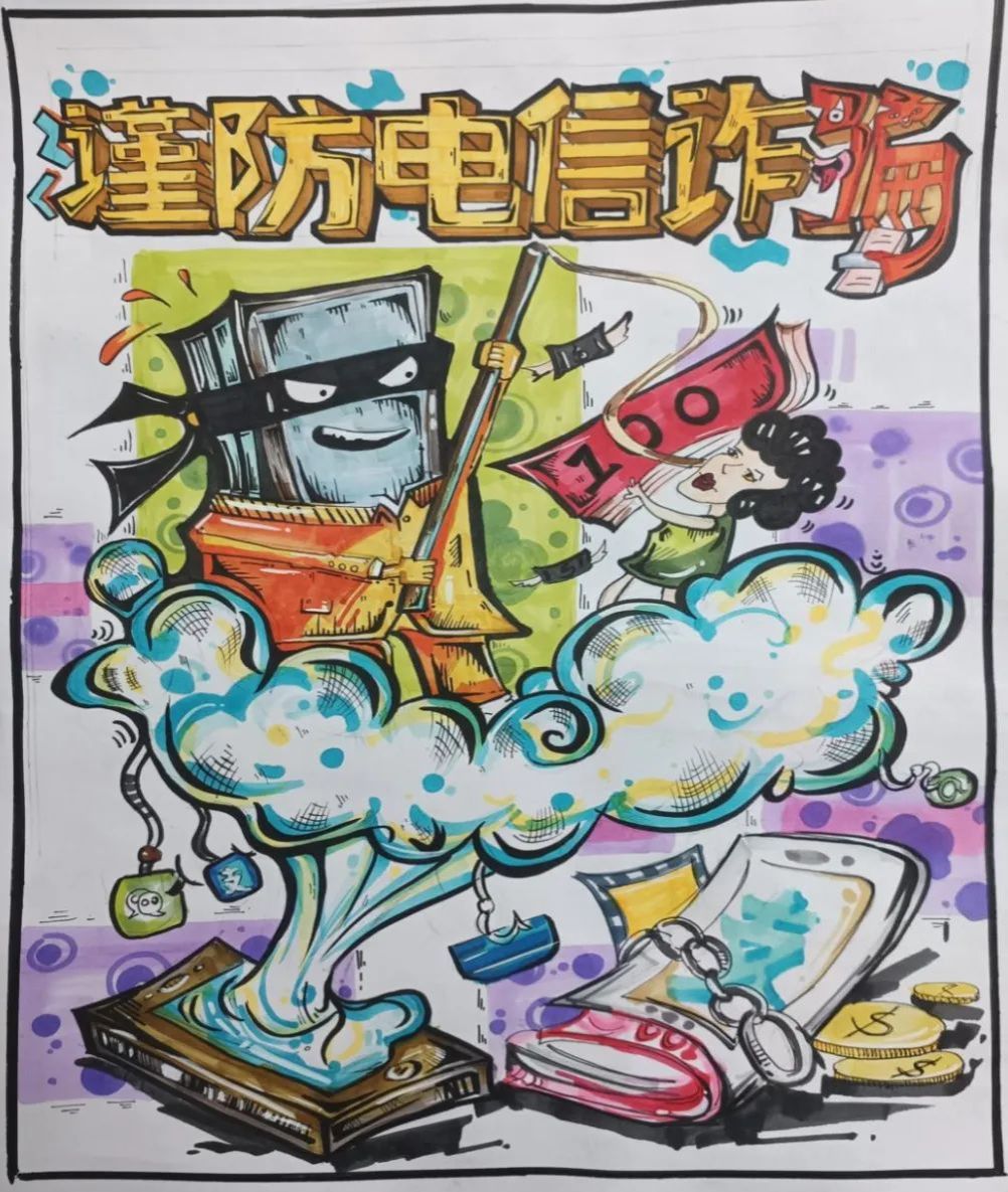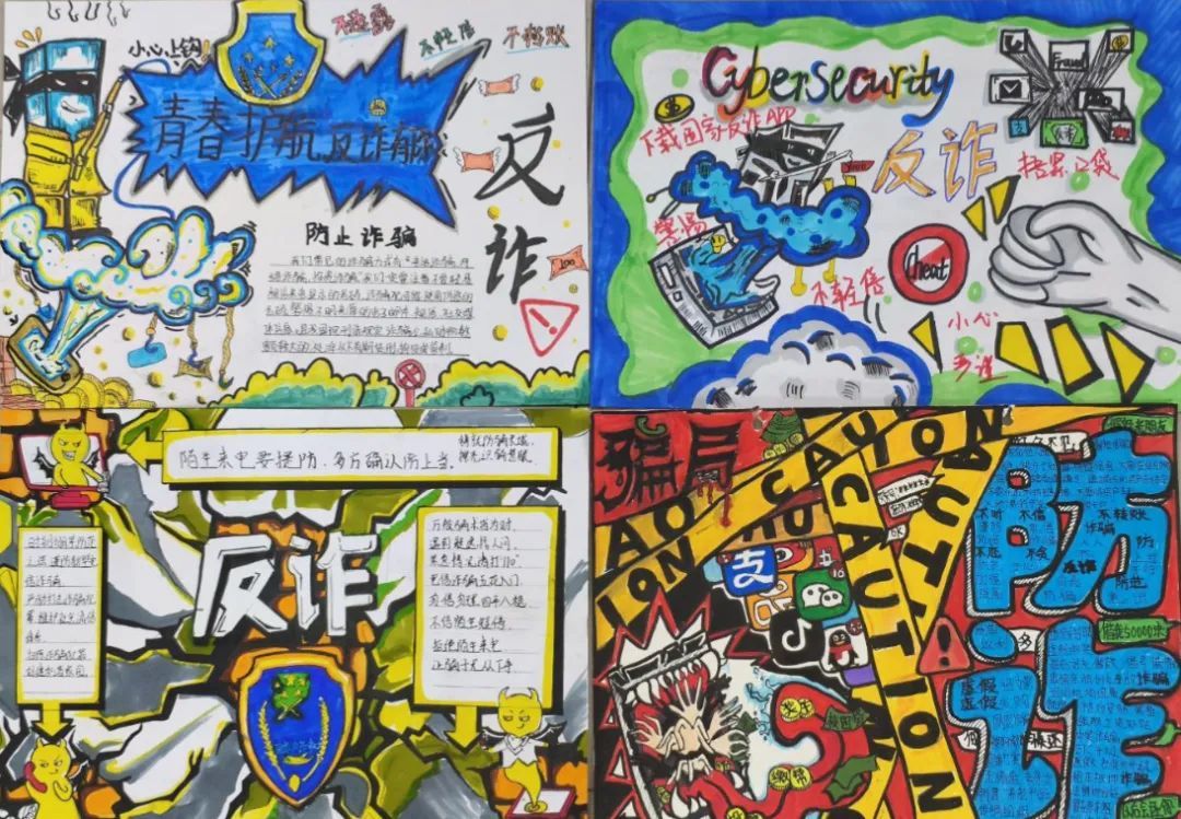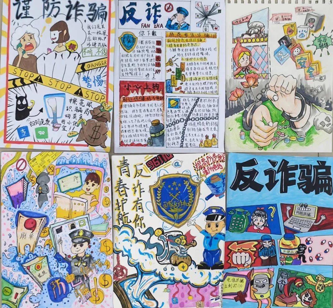 海报不仅色彩鲜艳、构图巧妙,而且寓意深刻,通过生动的形象和简洁有力的标语,向同学们传递了防范诈骗的重要信息。在这些作品中,有的以漫画形式展现了诈骗分子常用的手段和伎俩,提醒大家保持警惕;有的则以温馨的画面和感人的文字,呼吁同学们共同维护一个安全、和谐的校园环境。每一幅海报都凝聚着同学们的智慧和心血,充分展现了他们对反诈骗行动的热情和决心。