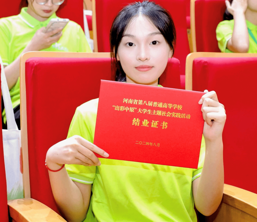 在学习上,她态度端正,仔细认真严于要求自己,入学后,有明确的学习目标,并制定合理的生涯规划,在2023-2024学年荣获“三好学生”、“优秀青年志愿者”荣誉称号。在2024年暑假期间,积极参加河南省第八届普通高等学校“出彩中原”大学生社会实践活动之“探寻非遗记忆,赓续传统文化”主题活动,在2024世界职业院校技能大赛-手工艺术品创意设计铜奖。她坚信那些看似不起波澜的日复一日,会突然在某一天,让人看到坚持的意义。