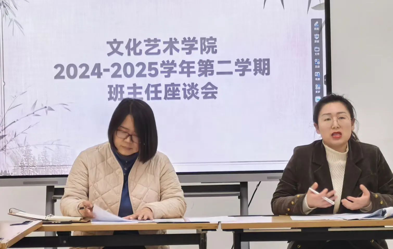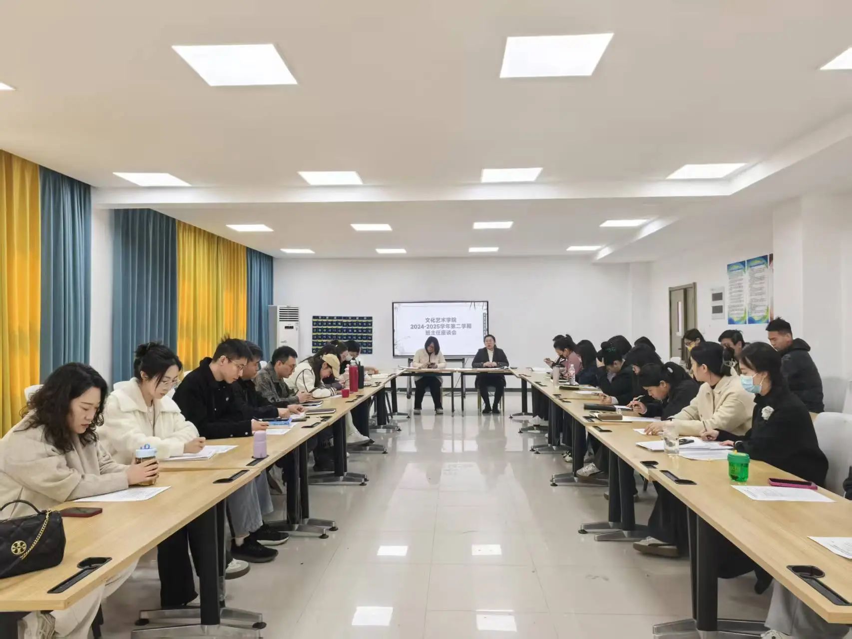 为进一步推进高质量班级建设,以良好的班风营造积极向上,健康和谐的学风、院风,3月19日中午,文化艺术学院在7B102召开“我为师生办实事”之班主任座谈会。会议由团总支书记冯思源主持,党总支书记杨慧丽出席会议,与全体班主任、专兼职辅导员座谈,研讨班主任工作与班级管理。
