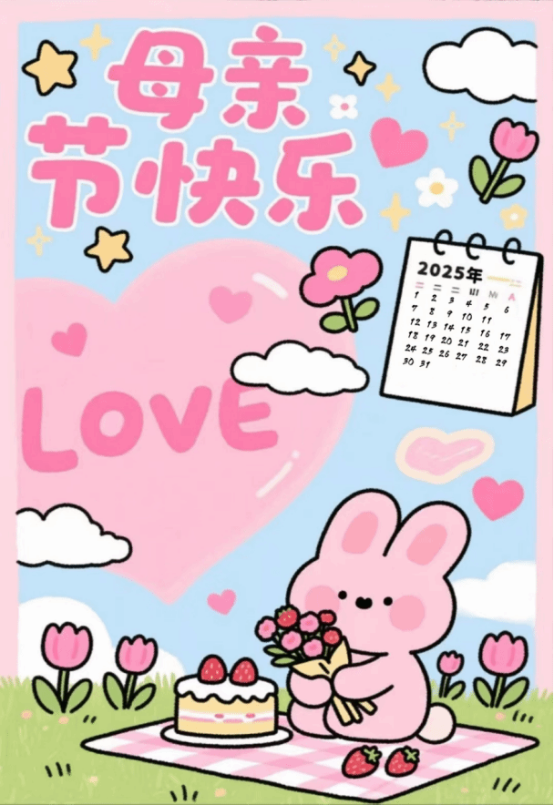 这幅母亲节主题插画洋溢着甜美温馨氛围。画面以明快的粉蓝为主色调,上方“母亲节快乐”几个大字醒目突出,周围点缀星星、爱心与花朵,传递美好祝福 。粉色爱心与“LOVE”字样强化爱意主题。可爱粉兔手持花束,与草莓蛋糕相映成趣,日历标注“2025年”,点明时间。整体构图活泼,色彩搭配和谐,满含对母亲的感恩与爱。