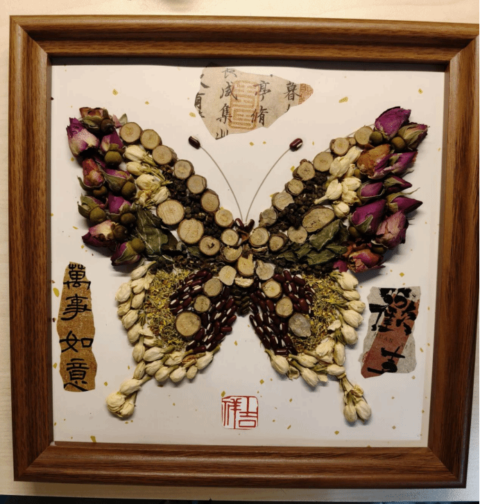 这幅蝴蝶画以水彩晕染背景,蝶翼缀以果壳和干花为主材料,翅尖轻触绽放的铃兰。蝴蝶象征破茧的勇气与蜕变的美好,希望她是妈妈,也更是会发光的自己。