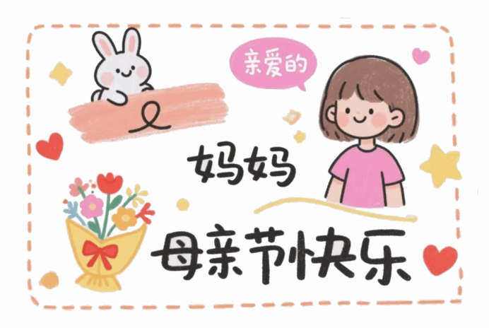 这张母亲节贺卡以简约可爱的手绘风格呈现。画面中,用流畅的线条勾勒出妈妈和孩子的形象,传递出亲密温馨的情感 。上方“母亲节快乐”几个字醒目突出,周围点缀着小花与星星元素,色彩明快活泼,满含对妈妈的美好祝福。