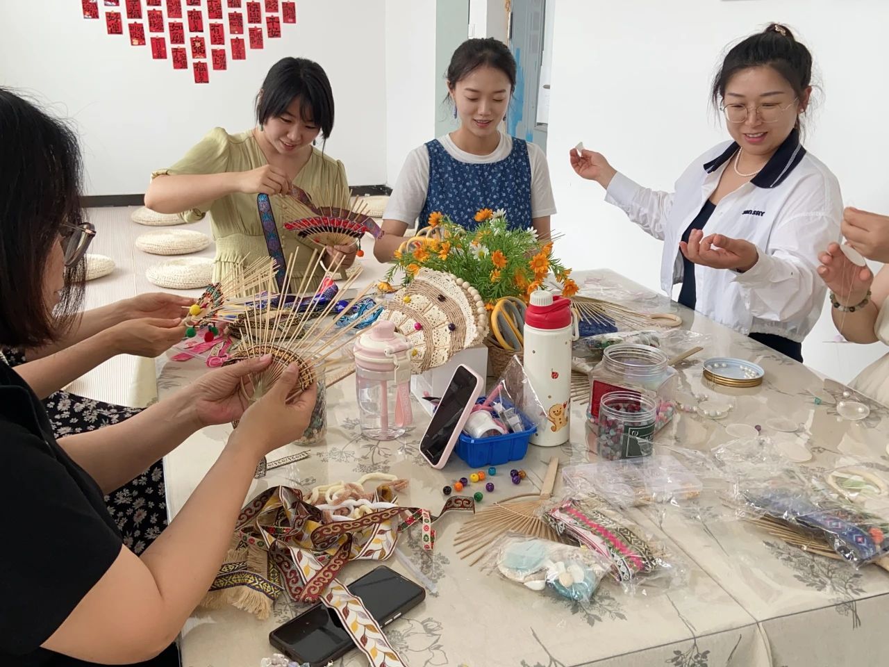 活动现场气氛热烈而温馨,老师们纷纷动手制作扇子。他们全神贯注,从精心搭配扇面,到巧妙装饰点缀,每一个环节都认真对待。