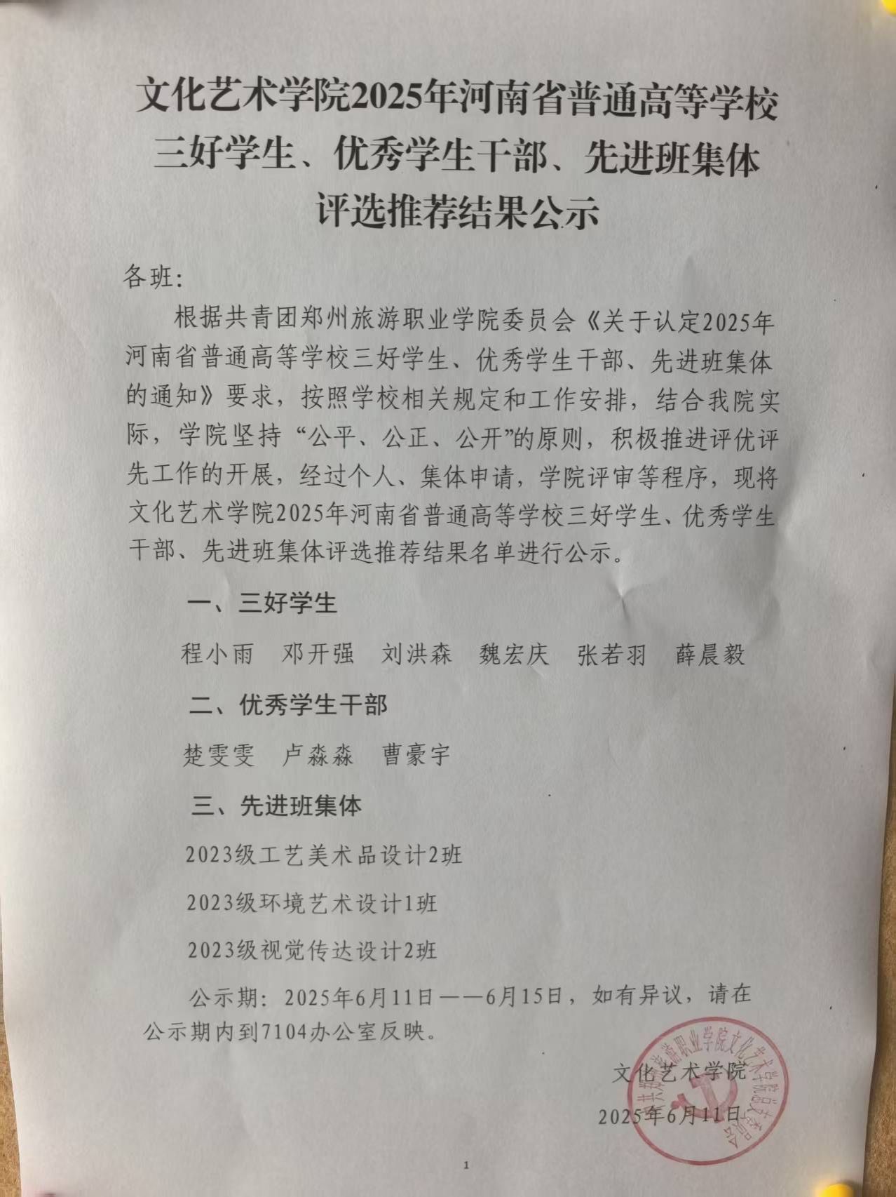 根据共青团pp电子游戏平台网站委员会《关于认定2025年河南省普通高等学校三好学生、优秀学生干部、先进班集体的通知》要求,按照学校相关规定和工作安排,结合我院实际,学院坚持“公平、公正、公开 ”的原则,积极推进评优评先工作的开展,经过个人、集体申请,学院评审等程序,现将文化艺术学院2025年河南省普通高等学校三好学生、优秀学生干部、先进班集体评选推荐结果名单进行公示。