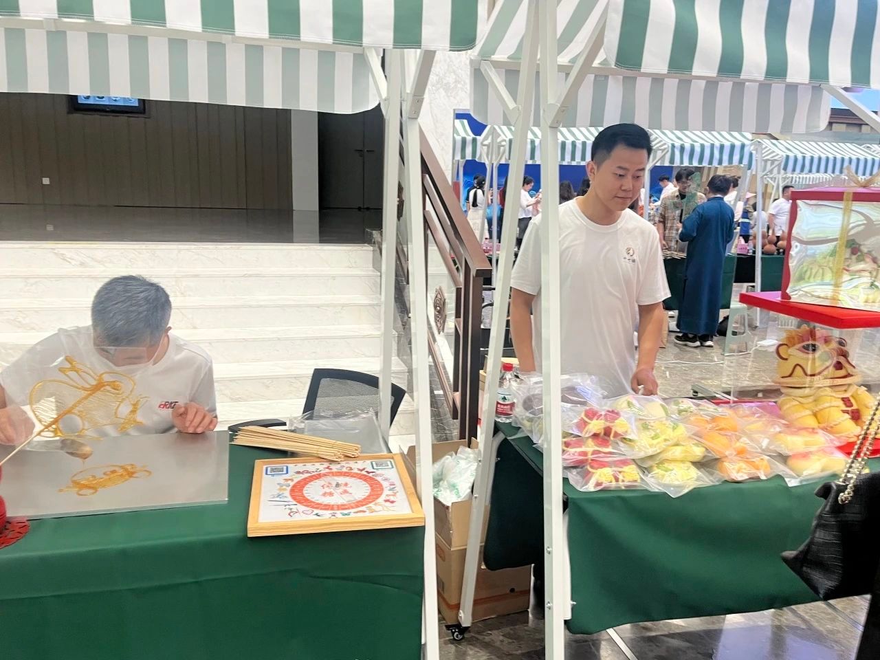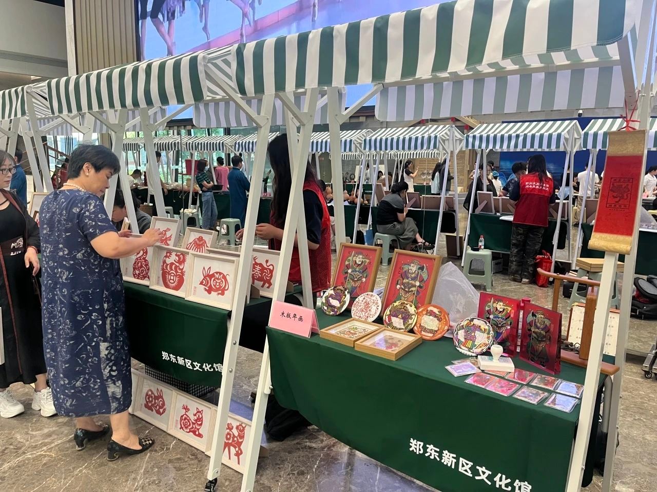 在文化馆一楼大厅,二十余项非遗瑰宝惊艳亮相。糖画灵动、花饽饽飘香,诗竹画、剪纸等尽显中华优秀传统文化的魅力,皮影戏诉说岁月故事。志愿者们穿梭于会场中,为前来参观的市民讲解介绍。我院师生创作的扎染手工艺品颇受市民喜爱,纷纷驻足交流,彰显了青年传承创新之力。