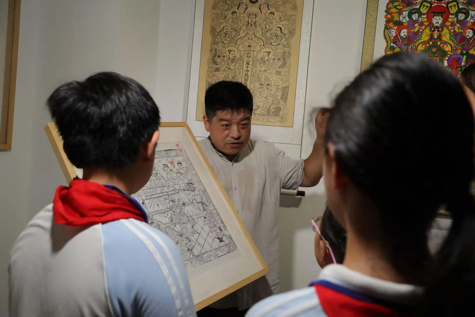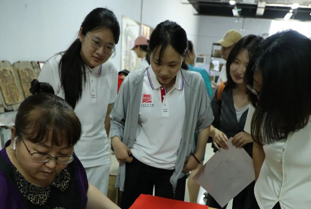 7月3日,在党总支书记杨慧丽的带领下,社会实践团第一站来到了开封木版年画博物馆。开封木版年画作为国家级非物质文化遗产项目,具有鲜明的地方特色。因其情节鲜明,构图饱满,形象生动,色彩浑厚等特点,极富于装饰效果,在现代社会也深受人们喜爱,具有较高的文化传承价值。实践过程中,队员们通过实地探访、研学体验、深度访谈等形式探究非遗技艺的深厚底蕴与当代传承创新之路。
