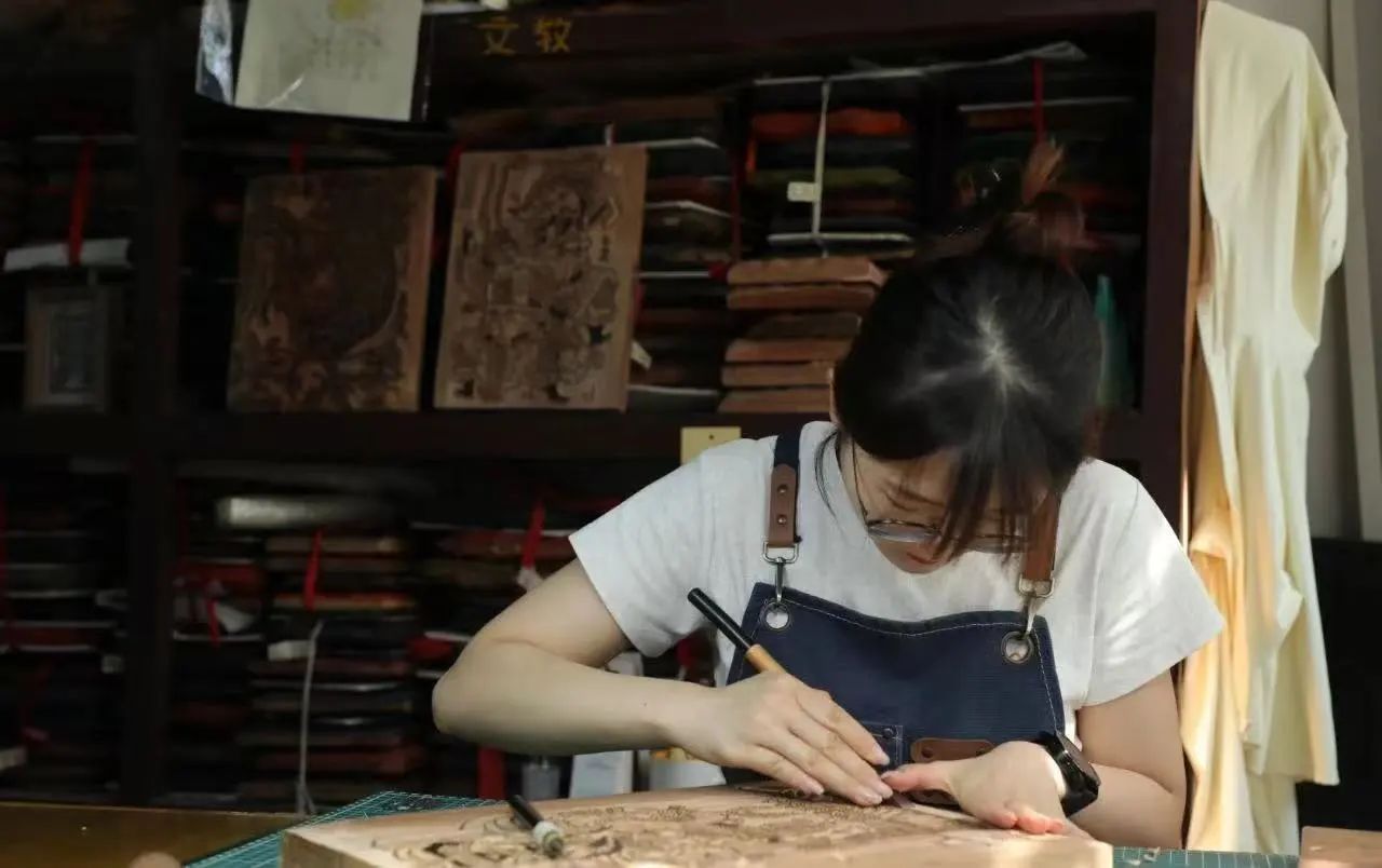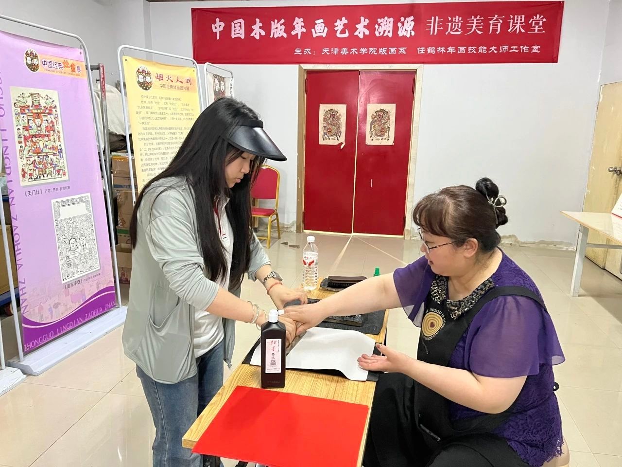 随后,实践团移步至雕版印刷工作室,观摩并记录木版年画的制作流程。在任大师及其弟子的细致讲解和示范下,队员们了解了从选木、制版到调色、套印的全过程。看着一块块雕版在工匠手中蘸取颜料、覆纸、刷印,瞬间跃然纸上的生动形象,大家无不惊叹于传统技艺的精妙。在师傅的指导下,队员们纷纷动手体验了拓印环节。亲手尝试如何控制力道、均匀刷印,感受着雕版的纹理与纸张的贴合,当自己亲手印制的年画作品呈现眼前时,那份参与感和成就感油然而生,对传统手工技艺的复杂性与工匠精神的崇敬之情也愈发深厚。