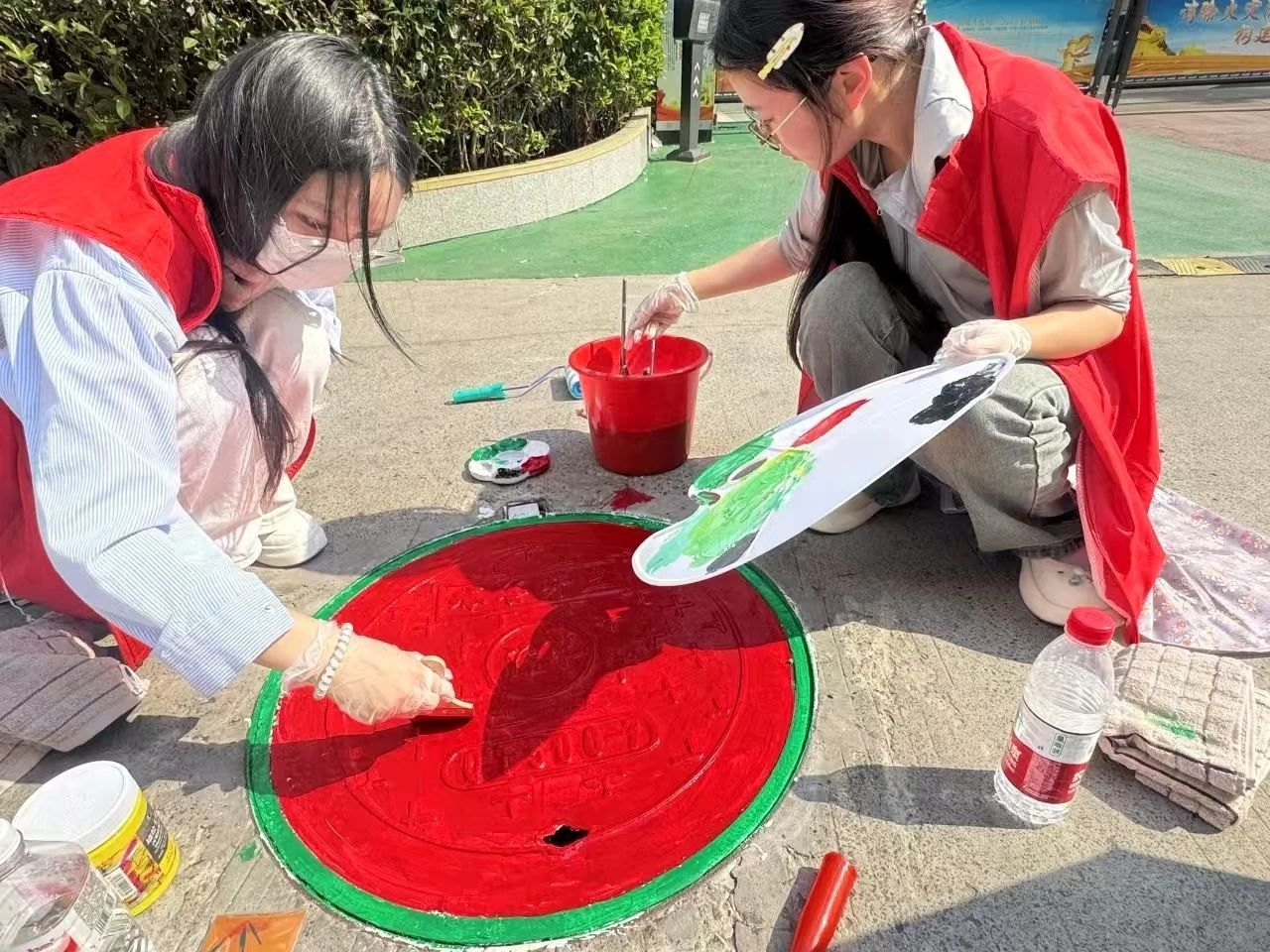 活动前期,我和团队成员依据专业所学,围绕“生态保护”、“垃圾分类”等环保主题构思井盖图案,并反复斟酌色彩搭配与画面布局,力求让每一幅图案都能生动传达环保理念。绘制时,大家不顾烈日炎炎,专注创作,引得社区居民纷纷围观。我主动与他们交流,讲解图案背后的意义,还邀请大家参与环保问答互动。对于有破损的井盖,我积极和社区沟通,推动及时修补,并和队友一起精心完善涂鸦细节。