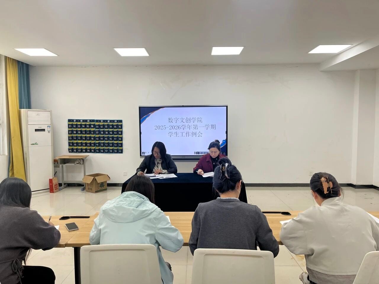 10月14日下午,数字文创学院在7B102室召开2025-2026学年第一学期第三次学生工作例会。学院党总支书记杨慧丽、全体专职辅导员参会,会议由团总支书记冯思源主持。会议围绕学生安全、日常管理及育人创新展开工作安排,旨在夯实工作基础,护航学生全面发展。
