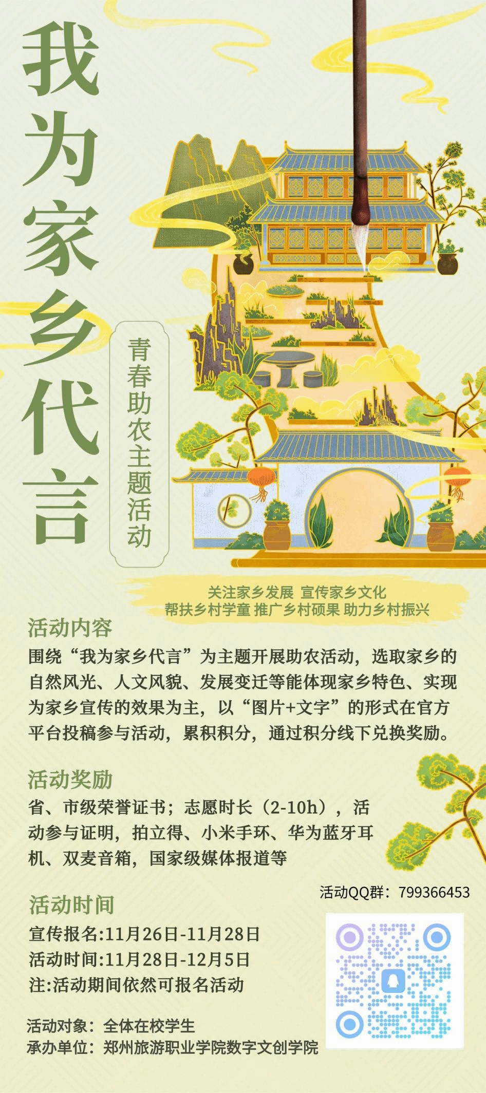 还在等什么呢?同学们,赶紧行动起来,扫描下方二维码加入我们,为家乡代言,让我们的校园因这场充满活力的活动而更加精彩!