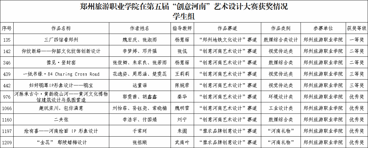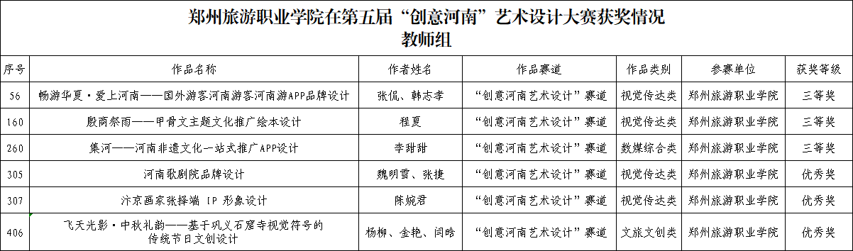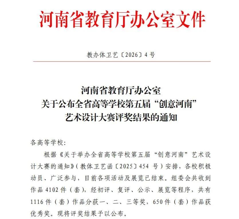 近日,河南省教育厅举办的河南省第五届“创意河南”艺术设计大赛中,我院师生凭借敏锐的创新思维及对地域文化的精准诠释,在此次大赛中斩获丰硕成果,共荣获16个奖项,包括一等奖1项、二等奖2项、三等奖5项、优秀奖8项。