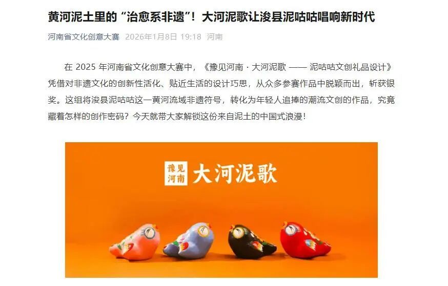 长期以来,学院重视文化创意人才培养与创新实践,师生团队在各类高水平专业赛事中屡创佳绩,优秀作品一直备受业界关注。近日,我院教师朱訚团队创作的作品《豫见河南·大河泥歌——泥咕咕文创礼品设计》,被河南文化创意大赛官方媒体予以专题报道。