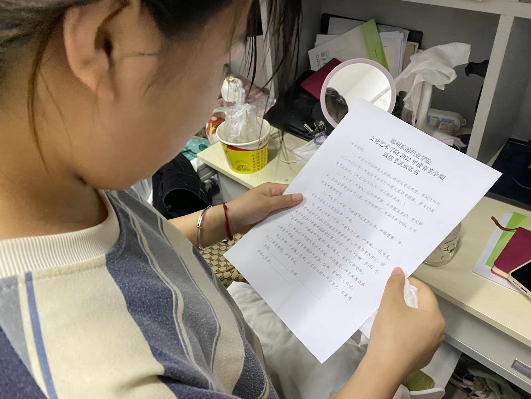 为进一步提高考生对诚信考试重要性的认识,强化考生自律意识,营造“违纪必究、作弊必罚”的考试环境。5月16日晚,我院老师还为每位学生发放了诚信考试承诺书,引导学生自觉抵制违纪作弊行为,清正考风,严肃考纪。我院学子也通过在承诺书签名的方式来表明自己对待考试的正确态度和诚信做人、诚信考试的决心。