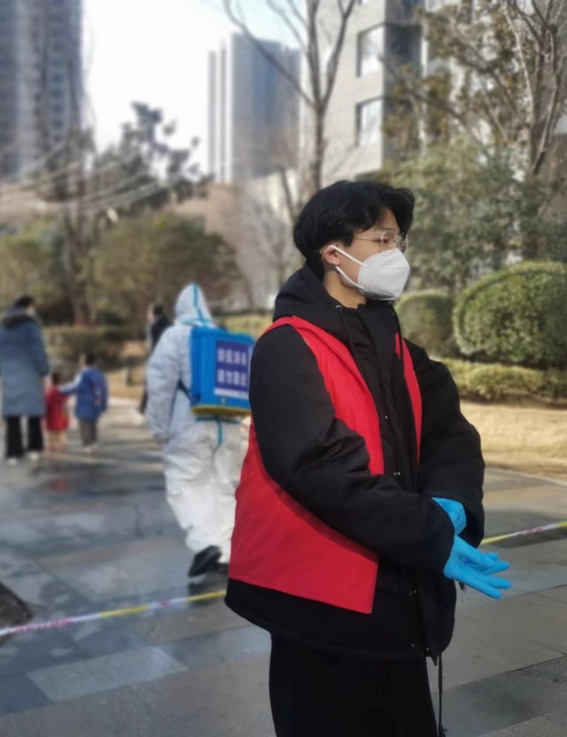 2022年1月10日,当各地还洋溢着新年到来的欢乐氛围时,新冠疫情再次反扑,此时刚刚放假回家的赵浩扬同学积极响应学院“万民团员进社区”的号召,主动到二七区杏苑社区报到,加入到疫情防控志愿服务队伍当中,负责核酸检测现场的疏导协调工作,帮助居民和医护人员完成检测前的筹备工作。他不惧病毒,勇敢担当,以真诚劳动践行着青春的诺言,承担起时代的使命。