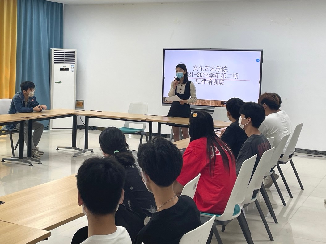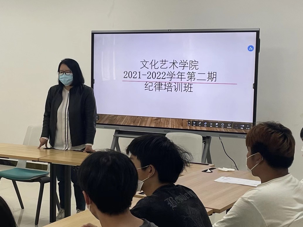 为推进优良校风学风建设,促进违纪学生的教育转化,增强学生的纪律意识,4月21日中午,文化艺术学院第2期纪律培训班在7B102举行。党总支书记杨慧丽,团总支代书记冯思源,全体专职辅导员出席仪式,来自各班共30余名违纪学生听会。仪式由辅导员闫晗主持。
