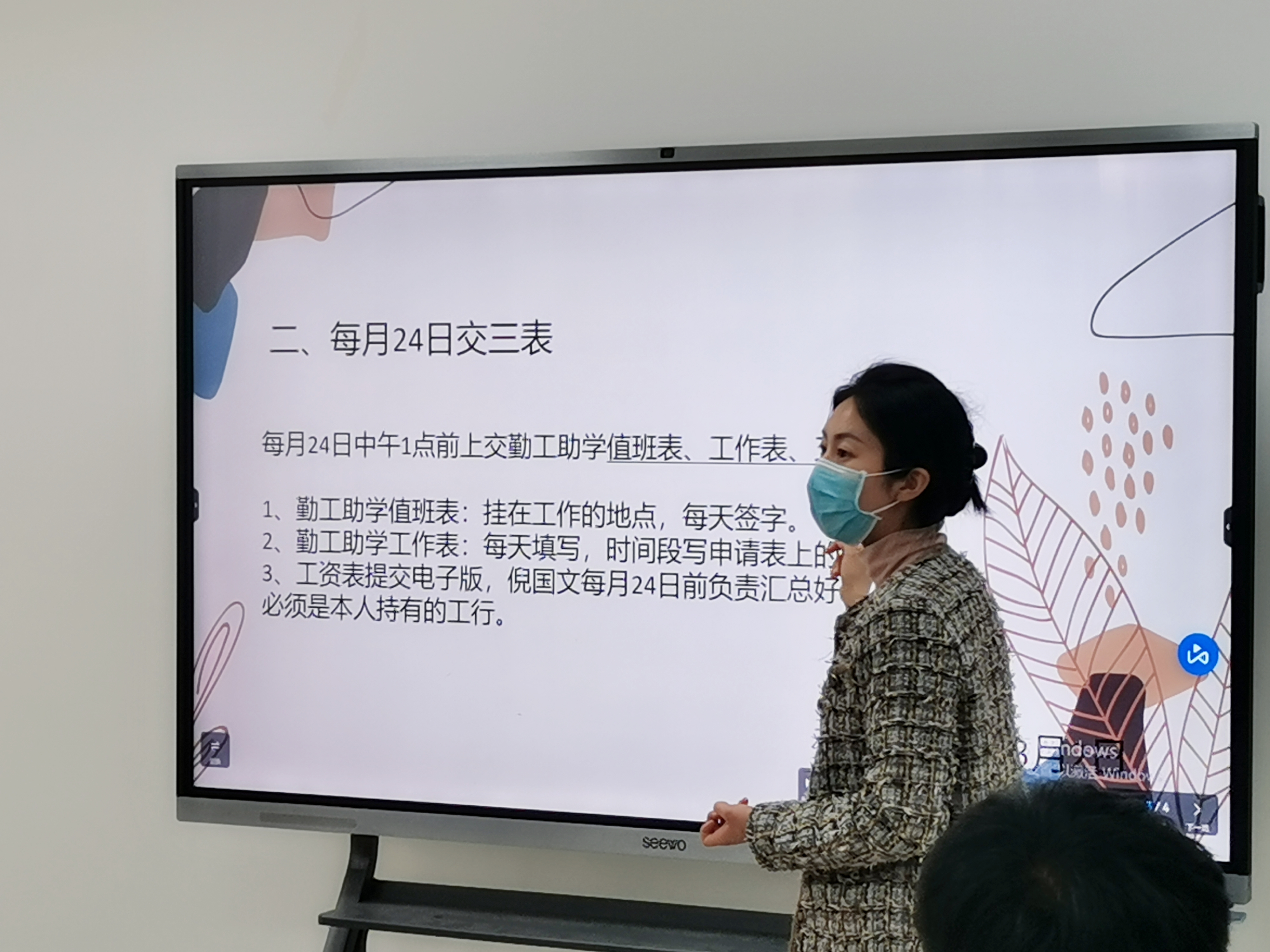 首先,麻梦琳老师明确了勤工助学同学的工作职责。分别对工资、考勤和签到这三个方面详细介绍了勤工助学相关工作的流程及上岗要求,重点强调了在办公室值班和实训室工作时的注意事项,并为勤工助学的同学提出了实用的建议。