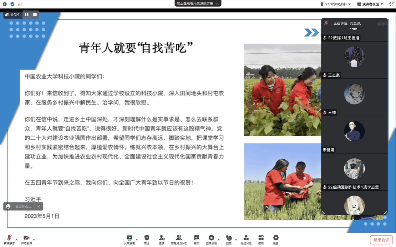 宣讲活动中,冯思源以习近平总书记在今年五四青年节前夕给中国农业大学科技小院的同学们的回信为例,讲述了习近平总书记与大学生在一起的故事。同时,冯思源还给大家推荐了《习近平的七年知青岁月》《习近平与大学生朋友们》两本书籍,希望以青年时期习近平的情怀和志向感染新时代的青年大学生积极践行时代使命,引导同学们深刻领悟习近平总书记对青年大学生的殷切关怀和期望。