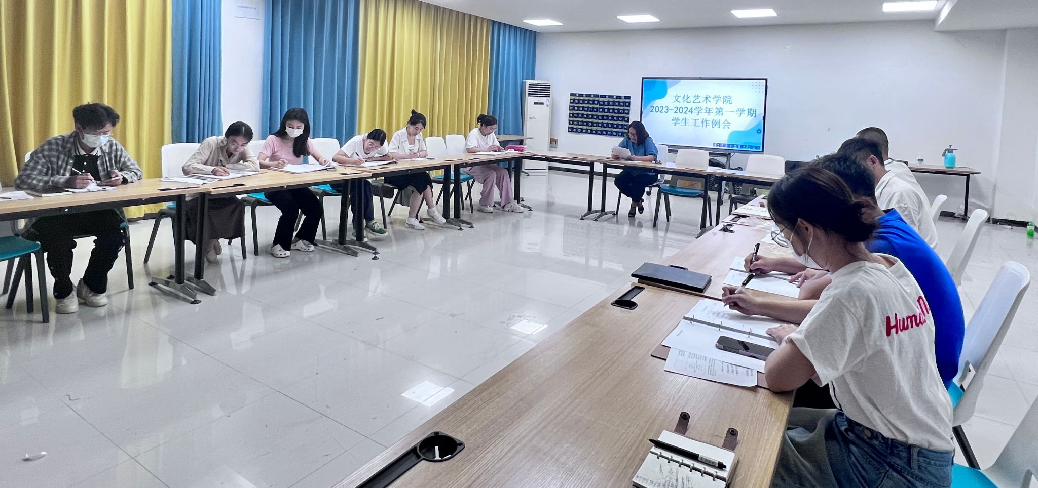 会上,杨慧丽向大家通报了关于军训期间的请假情况,并对新生入学教育、开学典礼、宿管系统维护等问题做出了安排。会议指出,文化艺术学院近期会重点开展有关大学生医疗保险、国家奖助学金评审工作。另外,杨慧丽就学生宿舍的相关问题进行解答,尤其是宿舍的消杀工作、宿舍的人脸识别问题、宿舍床位优化调整和宿管系统维护等问题。