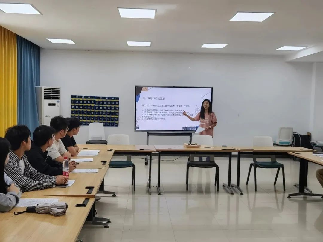 首先,席阳明确了勤工助学的工作职责。随后对工资、考勤和签到这三个方面做了详细介绍,重点讲解学院勤工助学工作的流程及上岗要求,强调了在办公室值班和实训室工作时的注意事项,并为勤工助学的同学提出工作建议。
