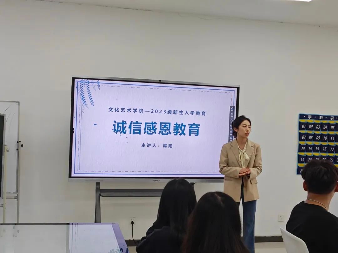 辅导员席阳给学生介绍了国家、社会、学校三个层面设立的奖助学金,并围绕诚信还贷、诚信考试、预防电信诈骗等方面开展了主题宣讲。席阳勉励同学们“于心知恩、于行感恩”,“诚实守信、立德立行”,怀着与新时代同心同向的理想信念,奋力谱写自己的青春华章。接着席阳向学生讲述自己对资助政策的了解、学生受资助的经历及受资助后奋发的历程,切实增强学生诚信意识,感恩意识。