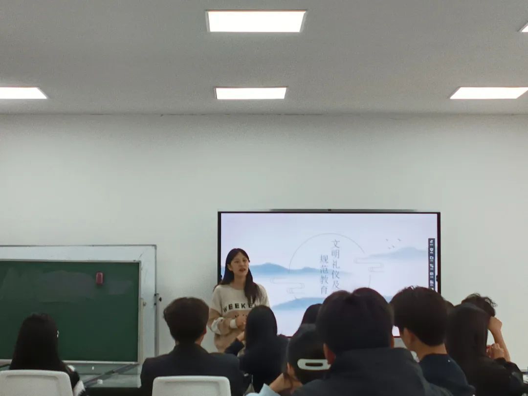 文明礼仪是大学生必备的基本素质,也是构建和谐校园的重要保障。为了让新生对文明礼仪有更深刻的理解和更深层次地领悟,2023年10月18日,我院开展新生入学教育之文明礼仪,由辅导员姜力元主讲。