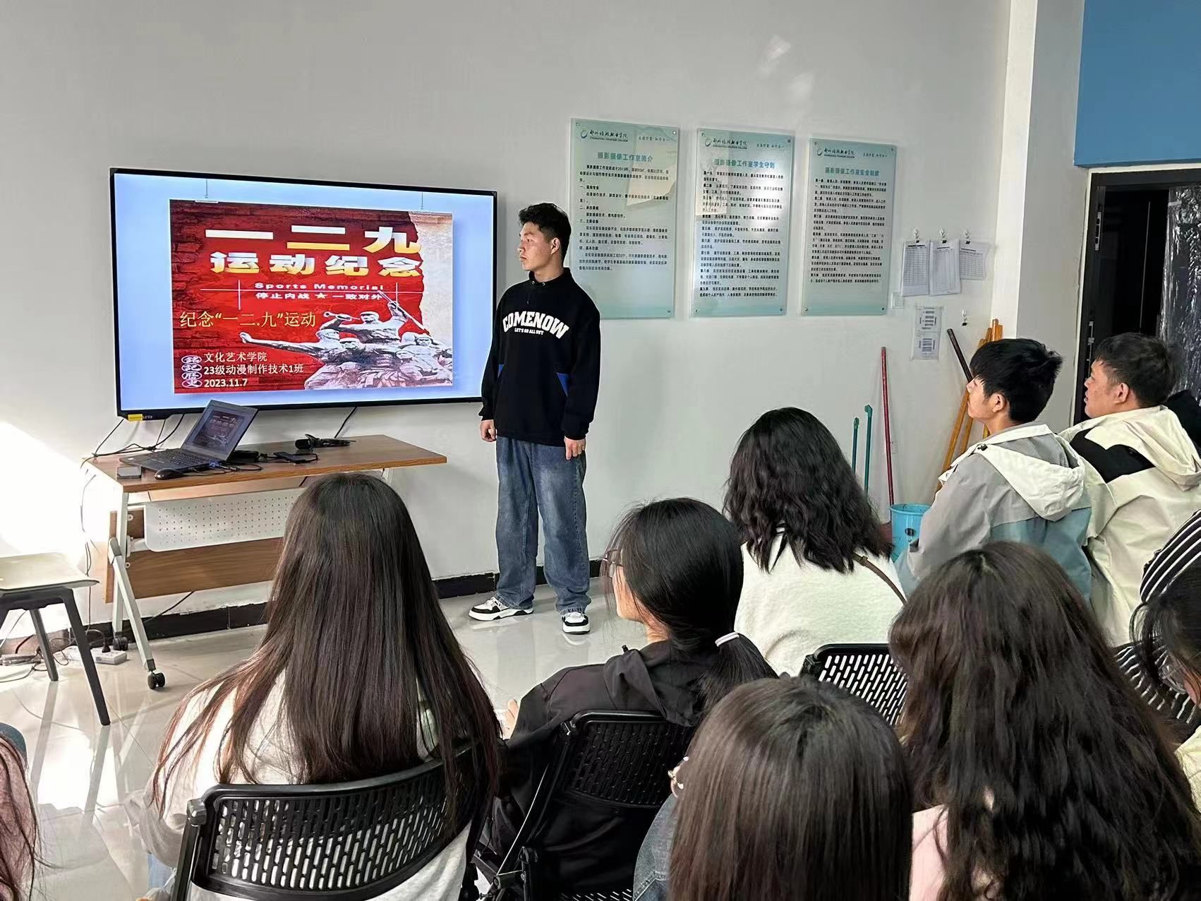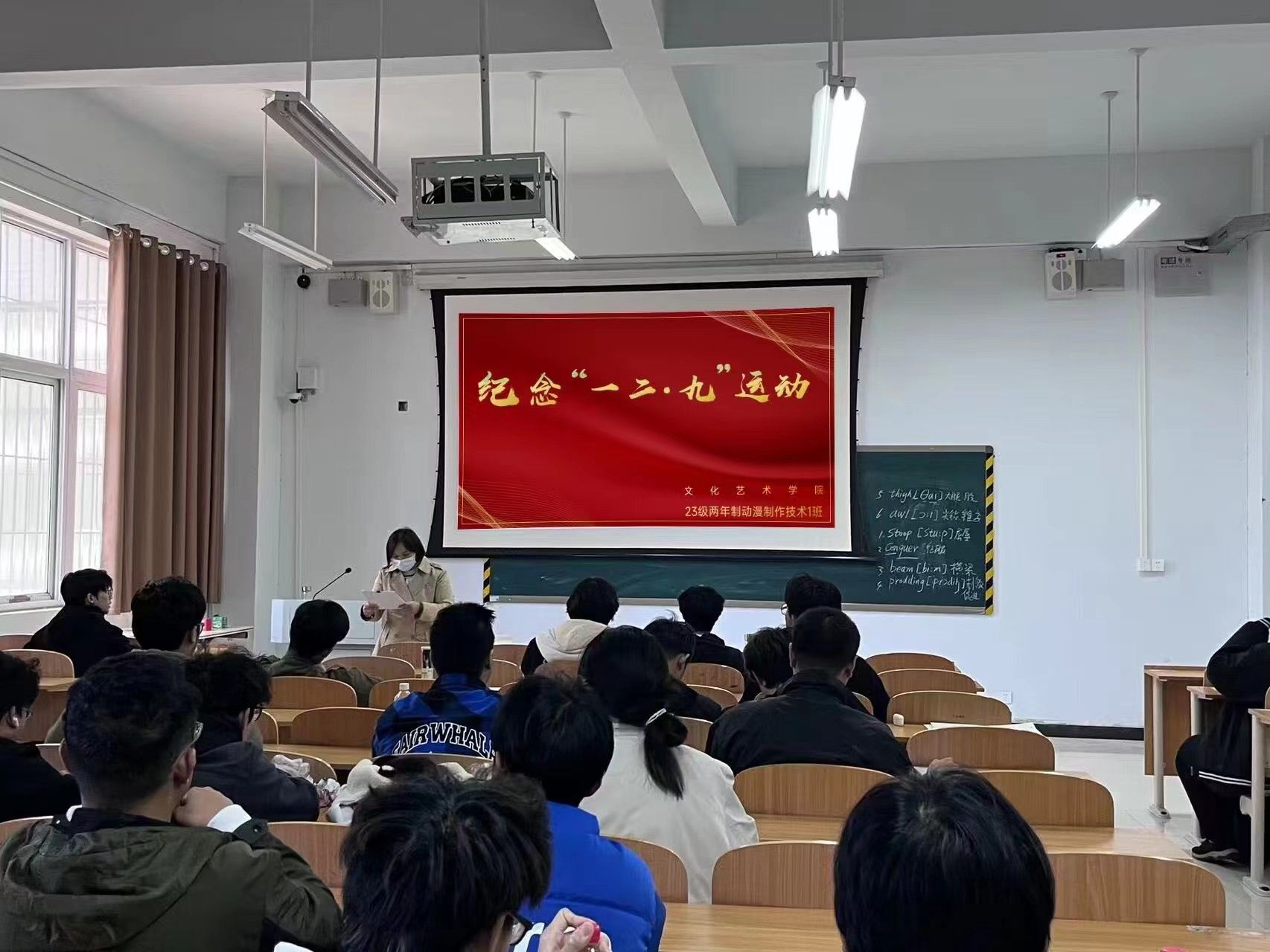 为了弘扬“一二·九”精神,缅怀英勇牺牲的烈士,激发学生爱国主义情怀。文化艺术学院于2023年11月15日在综合楼开展纪念“一二·九”运动主题班会。