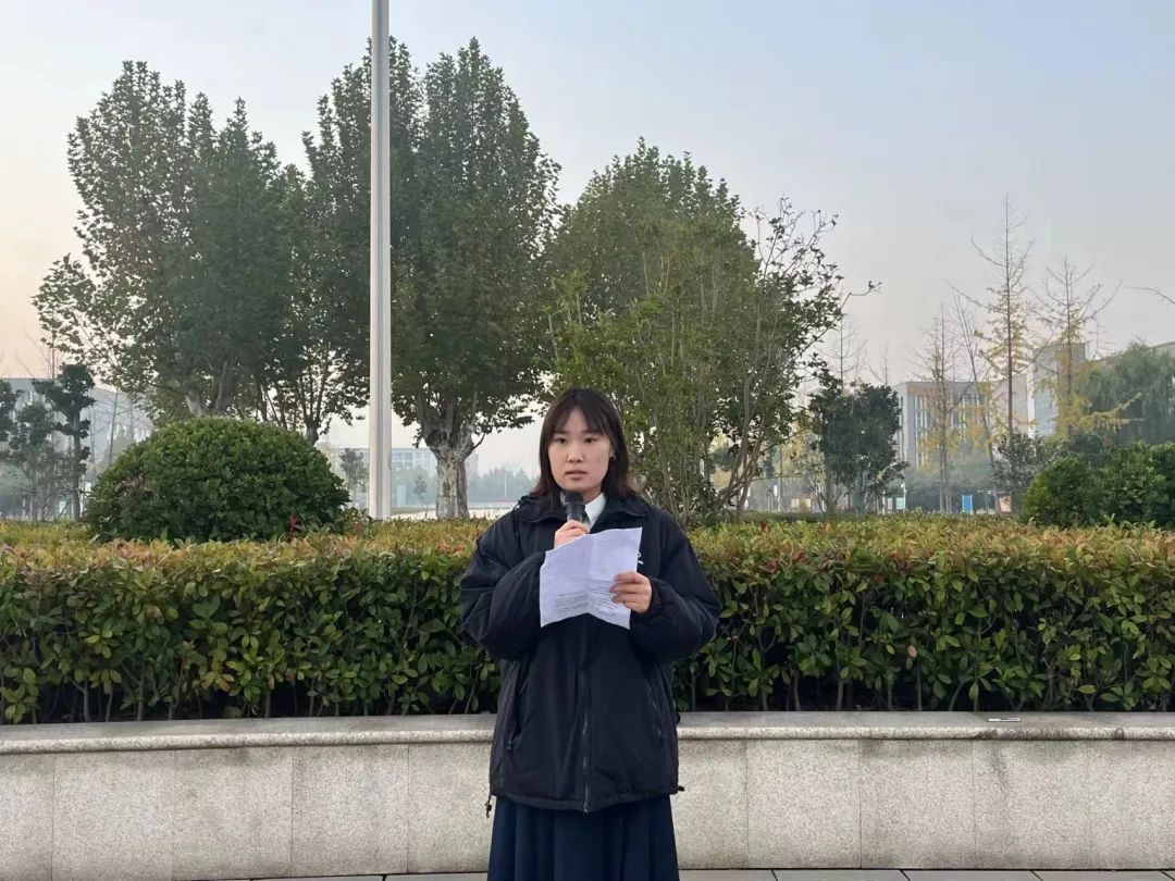 升旗仪式第三项,冯思源讲话,她强调了大学生身心健康的重要性,希望同学们积极践行社会主义核心价值观,注重文明素养,树立正确价值观,主动培养良好的行为习惯和健康的心理状态,共同营造和谐健康,积极向上的环境。