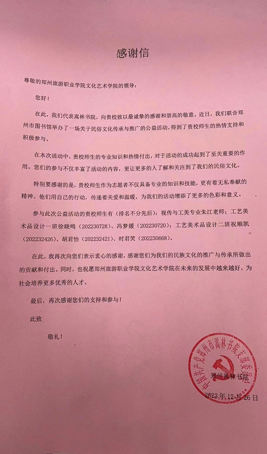 12月23日,嵩林书院与郑州市图书馆联合举办了一场民俗文化传承与推广的公益活动。我院“文艺在沃”青年志愿服务团队应邀参与了此次活动,受到了主办方的表扬。