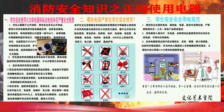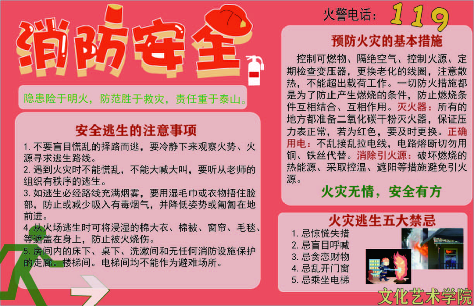 为进一步加强学生消防安全宣传教育,提升文化艺术学院消防安全管理水平,增强师生消防安全意识和自防自救能力,切实保障广大师生的生命安全,2021年11月1日起,文化艺术学院开展“提高自防自救能力 保障自身消防安全”为主题的消防安全教育宣传活动。
