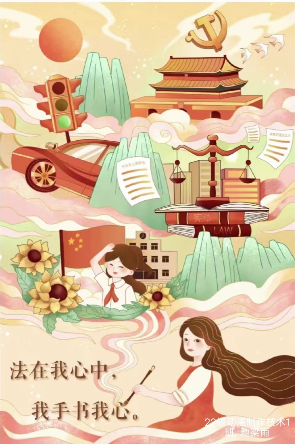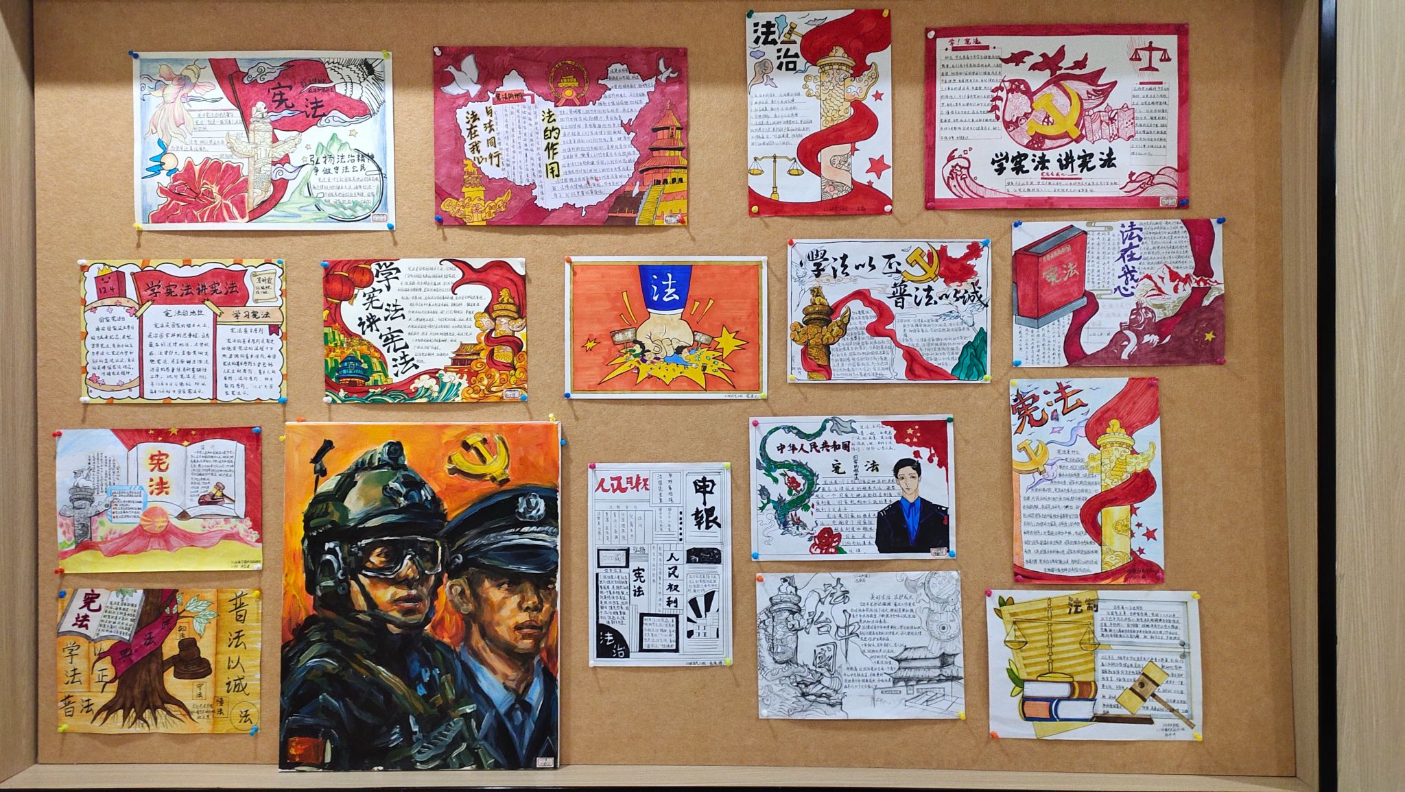 同时,文化艺术学院学子为法制宣传绘制了手抄报和海报并张贴在教学楼的宣传栏中,他们通过这种形式为学院营造了浓厚的法治环境。