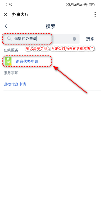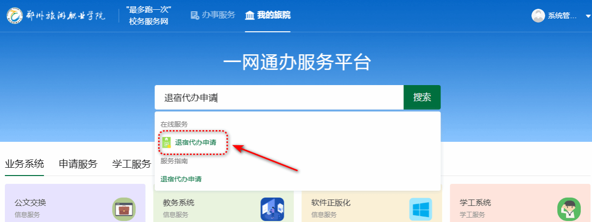 登录一网通办平台,在首页搜索框中输入关键字 “退宿代办申请”,在列出的服务列表中点击选中,直接打开申请页面;