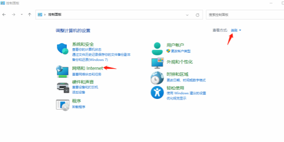 2. 进入控制面板后,选择“查看方法—类别”,选择“网络和Internet”