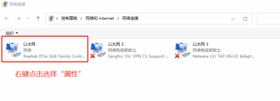 5. 进入查看后,即可查看到进行连接的网络,找到想要修改DNS的网络连接,右键点击然后选择“属性”