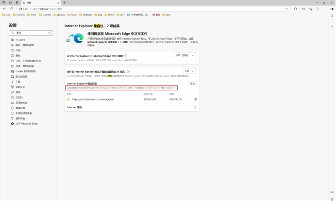 第二步:在左侧栏搜索 “兼容”,找到Internet Explorer 模式页面栏,添加常规模式下不能打开的链接。