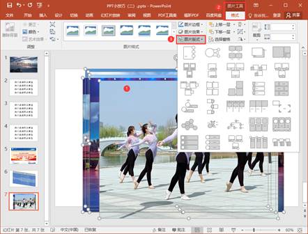 2、插入图片成功后,图片处于选中状态。选择“图片工具—图片版式”,选择自己想要的版式效果即可。本实例罗列了集中效果,供大家参考。