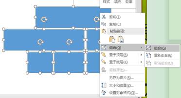 5、选中该幻灯片中的所有圆角矩形,鼠标右击选择“组合—组合”命令,将图形进行组合。