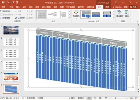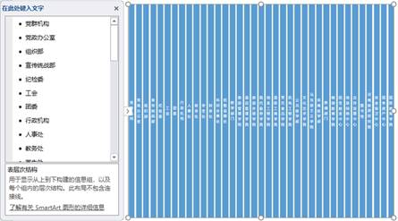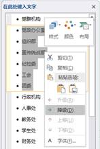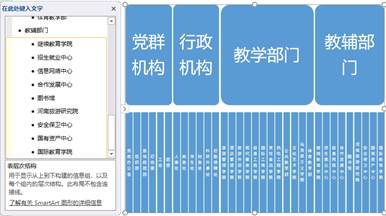 3、此时,我们发现效果不佳,层次关系并未展现。那么,我们可以在“在此处键入文字”部分,更改文字的层次关系。鼠标选中党群机构下属的五个部门,鼠标右击选择“降级”。同理,对行政部门、教学部门、教辅部门也进行相应处理,组织机构层次关系即可完美呈现。