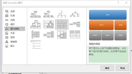 2、在“选择SmartArt图形”对话框中,选择所需要的布局样式,单击”确认“即可。本实例中选择了“层次结构”中“表层次结构。